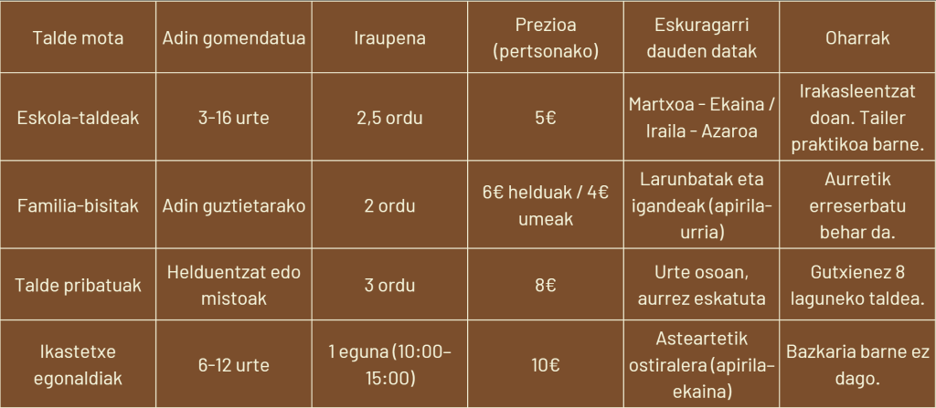 *Garrantzitsua: Talde bakoitzak gidari bat izango du, eta jarduerak egokitzen ditugu adinaren eta beharren arabera. Euri egunak? Ez da arazorik! Baditugu estalitako espazioak ere.